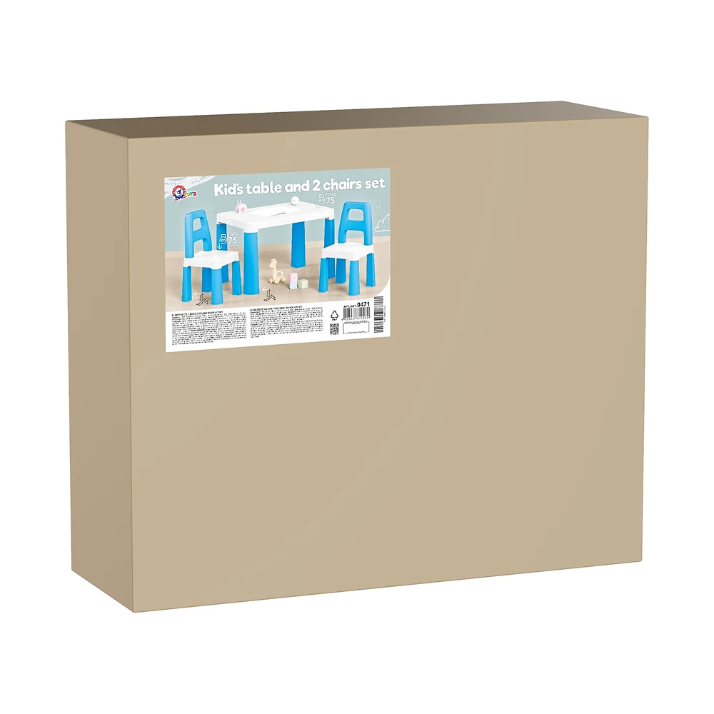 Realizat din plastic rezistent și sigur, setul are margini rotunjite pentru protecție sporită. Culoarea albastră, combinată cu suprafața albă a mesei, creează un aspect modern și plăcut, potrivit atât pentru camera copiilor, cât și pentru spații de joacă.