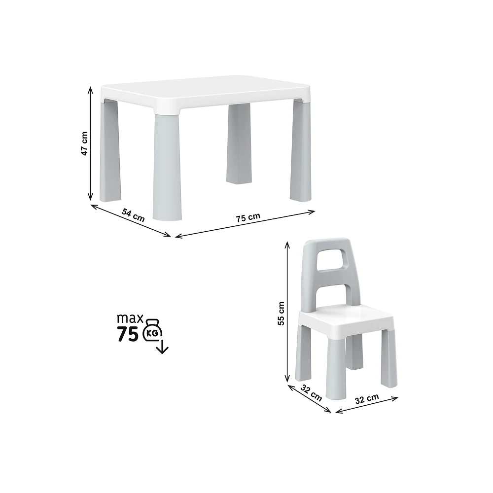 Setul de mobilier pentru copii cu masă și două scaune este conceput special pentru a oferi celor mici un spațiu confortabil și sigur pentru activitățile zilnice. Designul simplu, în culoare gri, se potrivește ușor în orice cameră de copil, creșă sau spațiu de joacă.