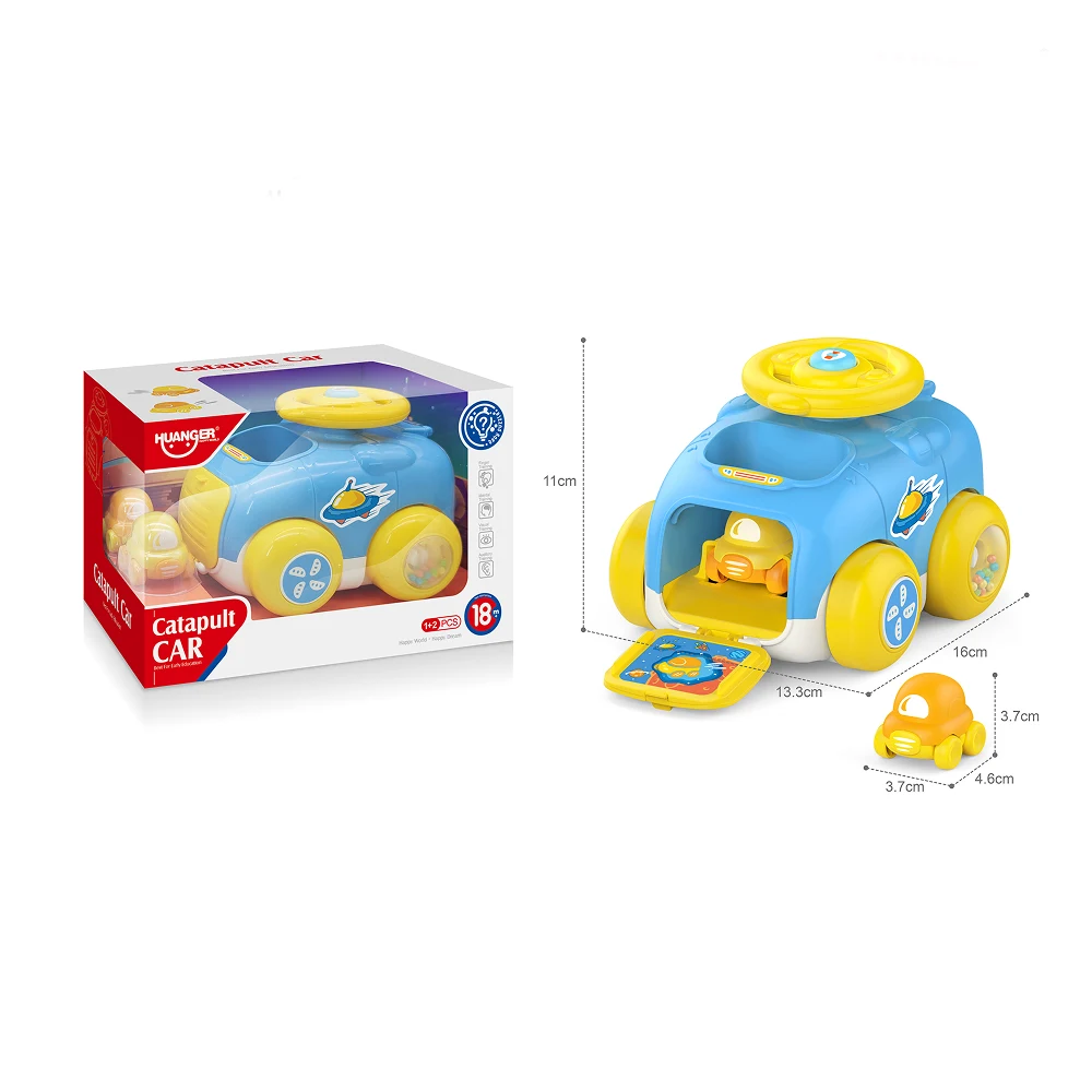 Set de joacă pentru copii format dintr-o mașină mare cu mecanism de lansare și un vehicul mic inclus, ideal pentru joacă activă și creativă.