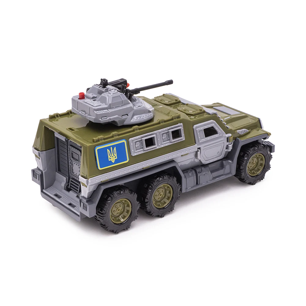 Mașină militară blindată pentru copii 3+ ani, realizată din plastic rezistent și non-toxic. Dimensiuni 282 × 128 × 155 mm, ideală pentru jocuri de acțiune și scenarii militare.
