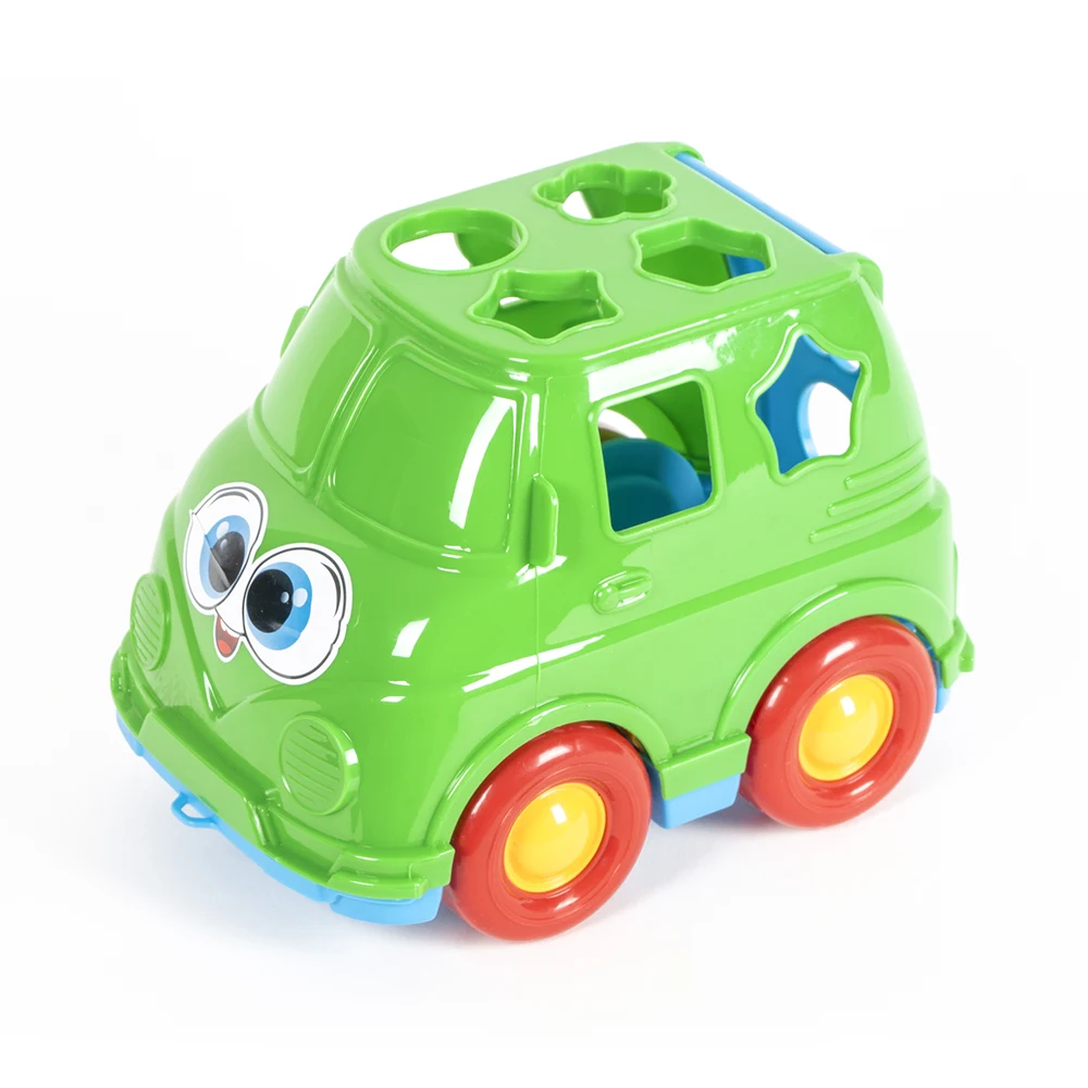 Microautobuz educativ cu forme colorate, potrivit pentru copii de 6+ luni, dimensiuni 230 × 155 × 160 mm, ideal pentru dezvoltarea coordonării și învățarea formelor.