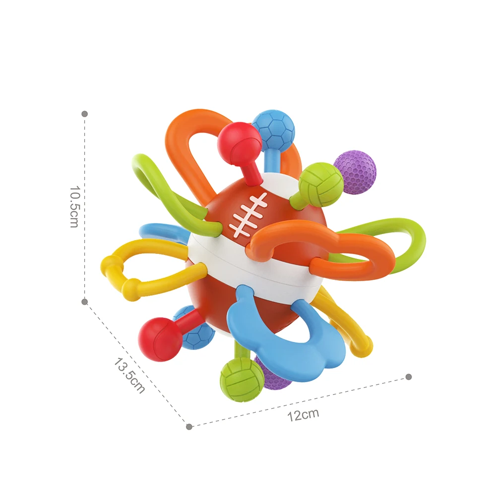 Această minge senzorială este concepută special pentru joaca timpurie a bebelușilor, având o structură flexibilă și o formă ușor de apucat. Elementele multiple, dispuse radial, oferă texturi diferite și zone de prindere care încurajează explorarea activă și dezvoltarea motricității fine.