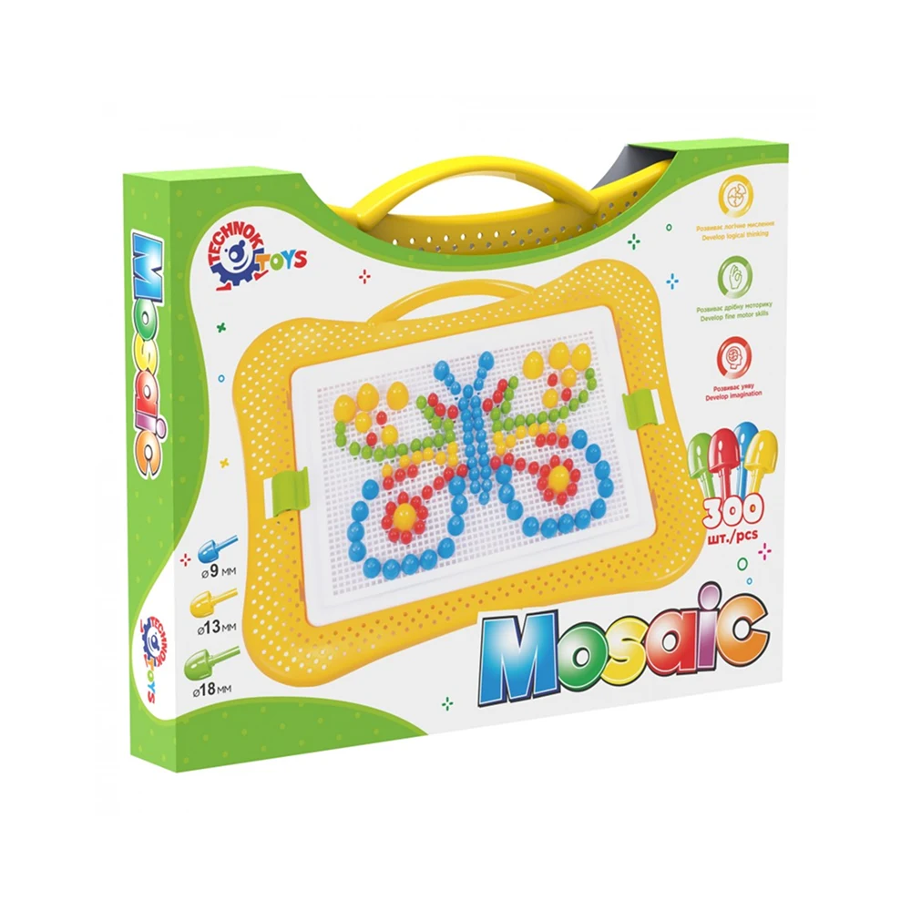 Mozaicul pentru copii cu 300 de piese este o jucărie educativă complexă, destinată copiilor de la 5 ani, care stimulează creativitatea, atenția și coordonarea. Copiii pot crea imagini detaliate și modele variate prin aranjarea pieselor colorate pe tabla de joc.