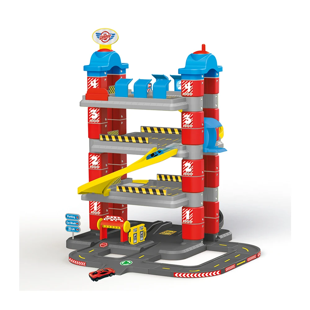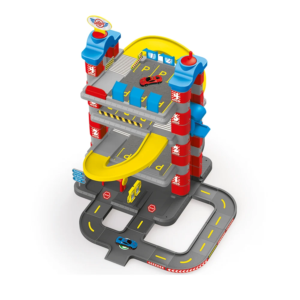 Parcare de joacă pe 4 niveluri pentru mașinuțe, cu rampă și lift, ideală pentru jocuri de rol și distracție activă. Recomandată copiilor de la 3 ani.