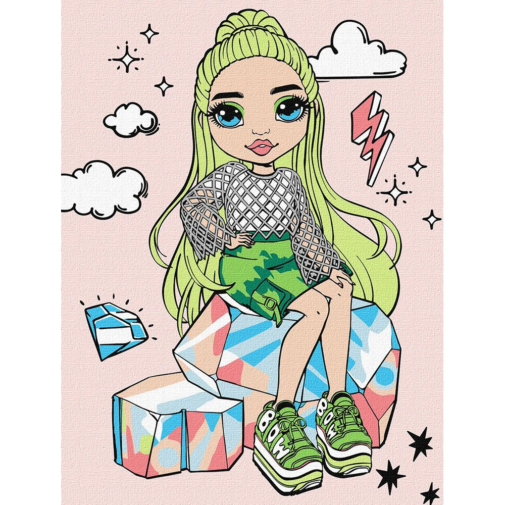 Pictură pe numere Rainbow High, ideală pentru relaxare și creativitate. Include pânză pe cadru, culori acrilice și pensule.