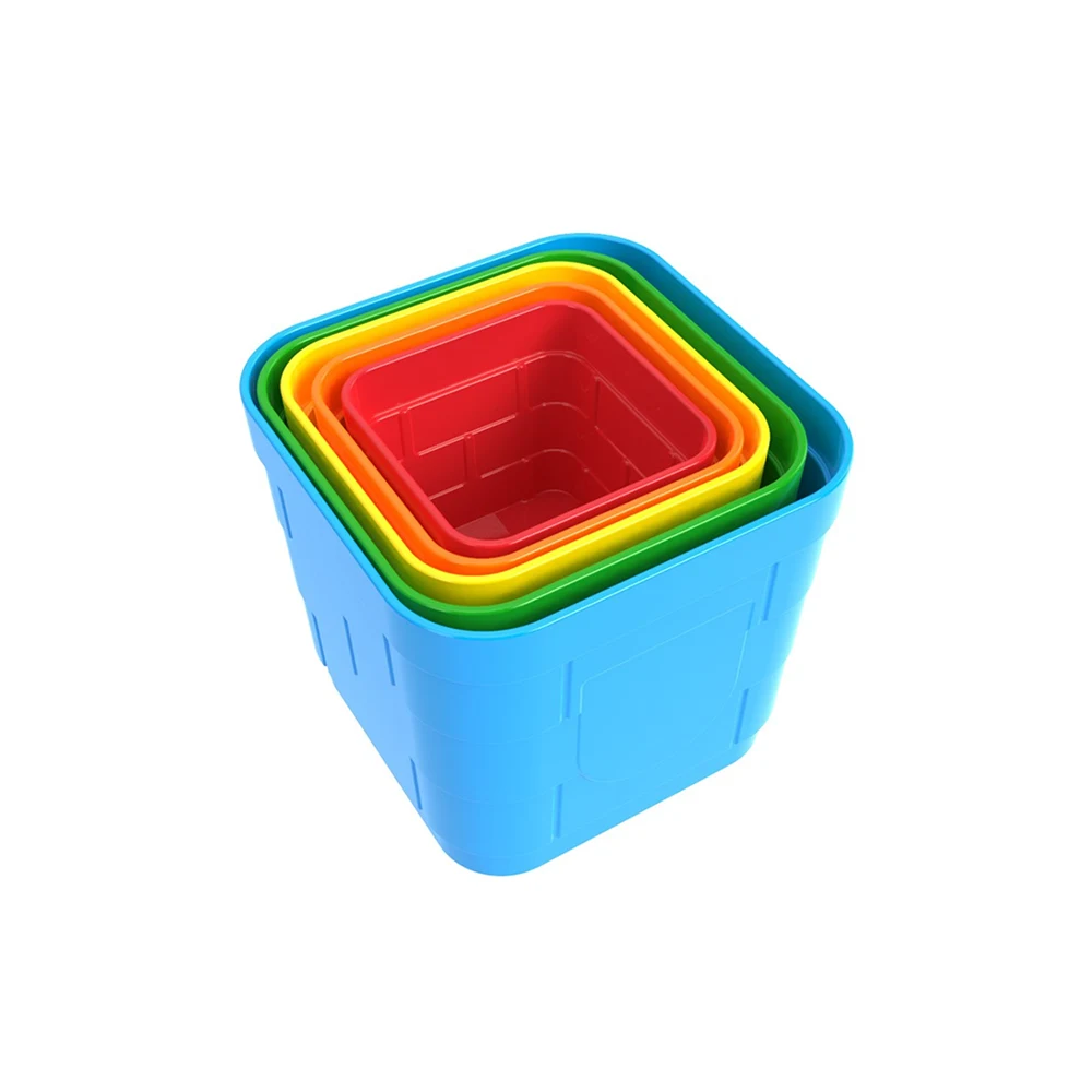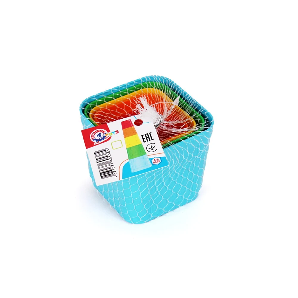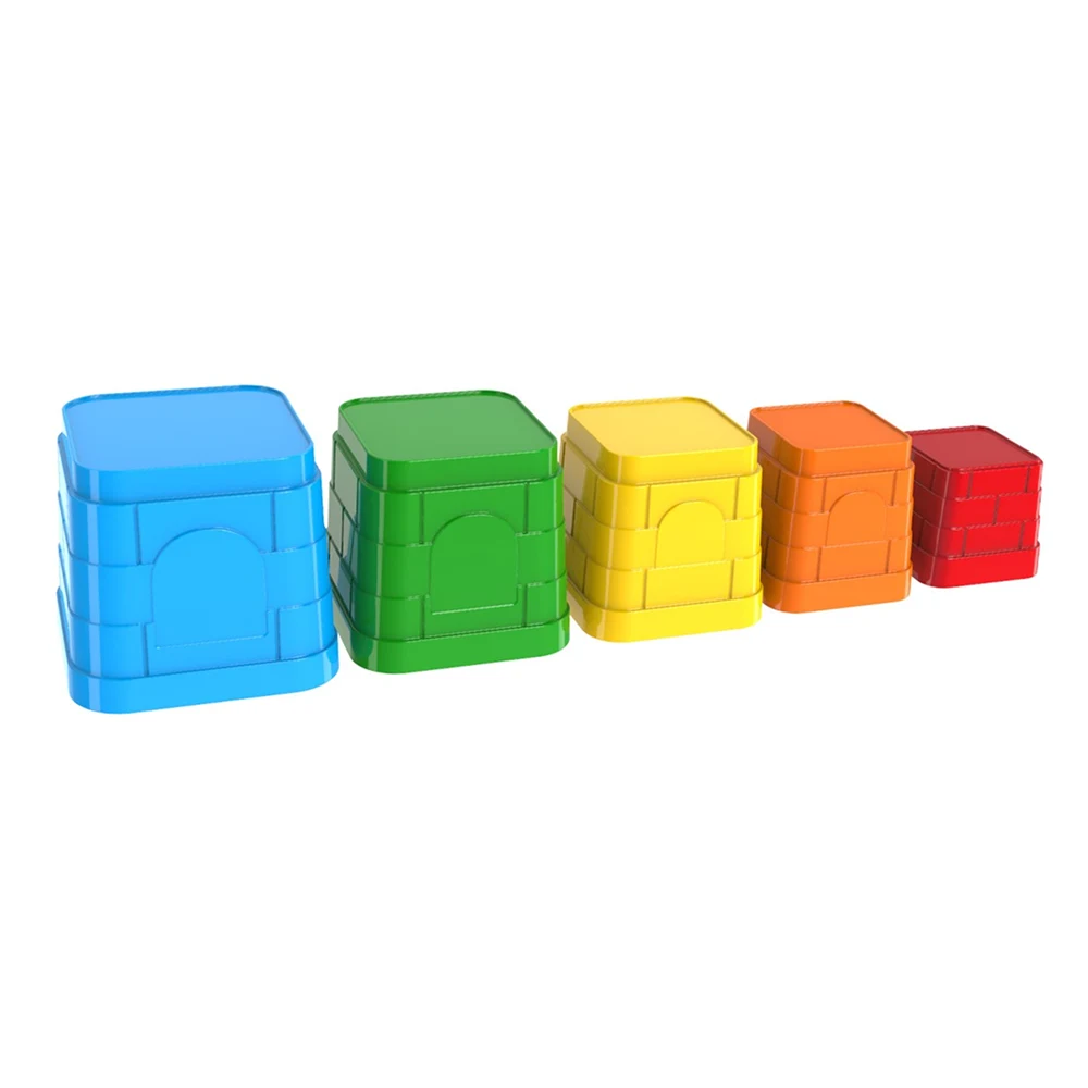 Set de joacă format din 5 elemente de dimensiuni diferite, care pot fi suprapuse pentru a crea diverse combinații. Fiecare piesă are formă pătrată și culori vii, ceea ce face jocul mai atractiv și ușor de înțeles.