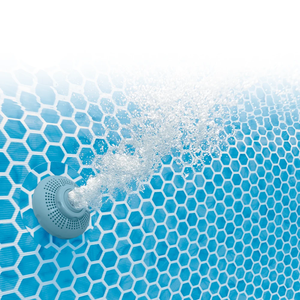 Structura este realizată din oțel galvanizat rezistent la coroziune, iar picioarele de susținere în formă de U asigură stabilitate optimă pe întreaga lungime a piscinei. Pereții sunt fabricați din material PVC armat în 3 straturi, rezistent la presiunea apei, perforare și uzură zilnică.