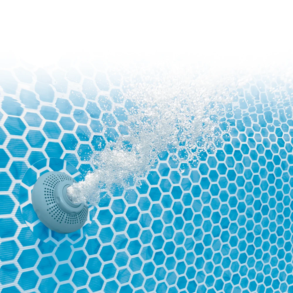Setul este echipat cu pompă de filtrare cu debit de 3785 L/h, care contribuie la menținerea apei curate și la o întreținere eficientă. În pachet sunt incluse scară pentru acces sigur, prelată pentru protejarea apei împotriva impurităților și covor de protecție pentru baza piscinei, oferind o soluție completă și pregătită pentru utilizare.