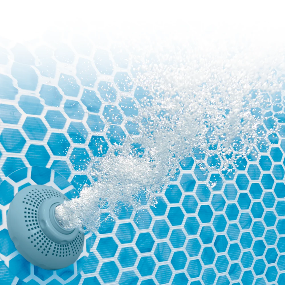 Pereții sunt fabricați din PVC armat în 3 straturi, utilizând tehnologia SUPER-TOUGH™ – două straturi de PVC dens și un strat intermediar din poliester – pentru rezistență sporită la presiunea apei și uzură zilnică.