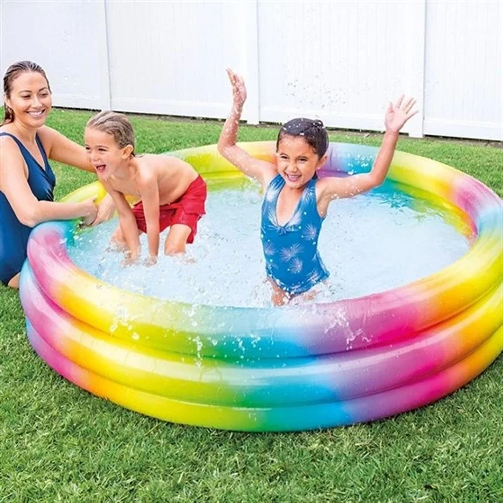 Piscină gonflabilă Rainbow Ombre, spațioasă și colorată, perfectă pentru distracția celor mici în zilele călduroase. Construcția cu 3 inele gonflabile oferă stabilitate, iar designul vibrant în degrade transformă fiecare moment de joacă într-o experiență plină de energie. Capacitate 581 L, potrivită pentru 2+ ani.