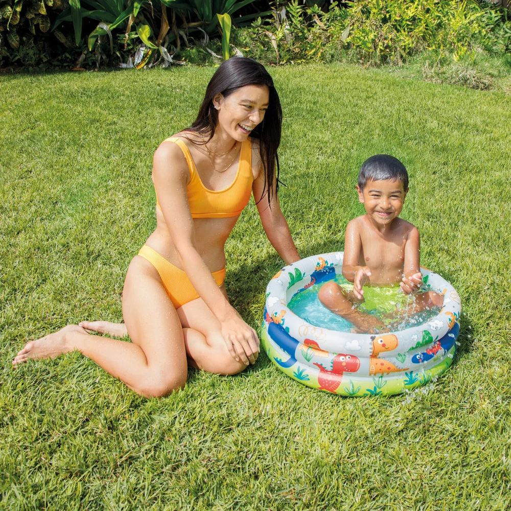 Piscină gonflabilă Dino Buddies, ideală pentru primele bălăceli ale celor mici. Designul vesel cu dinozauri și construcția cu 3 inele gonflabile oferă stabilitate și siguranță în timpul utilizării. Capacitate 28 L, potrivită pentru 1–3 ani.