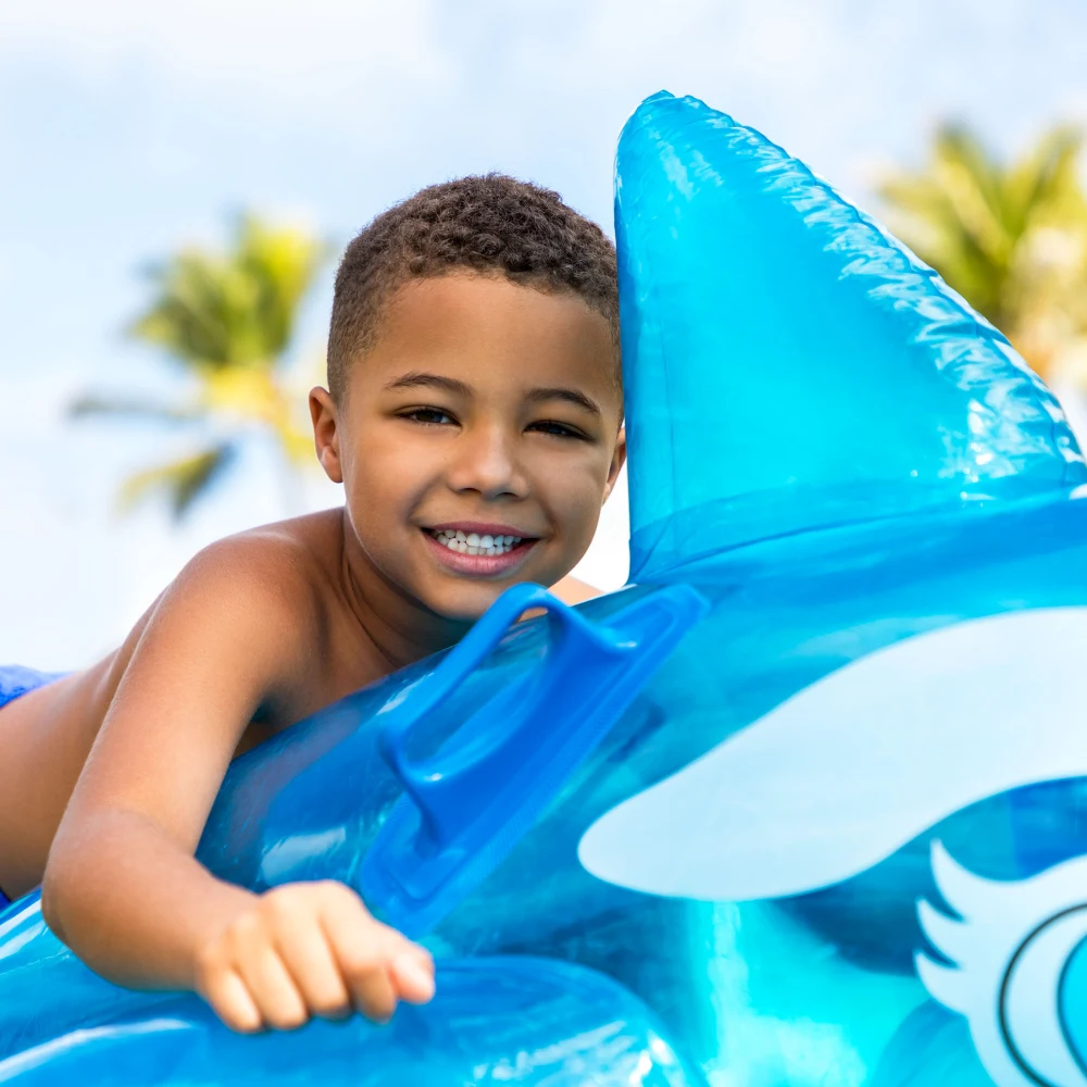 Plută gonflabilă în formă de balenă, cu mânere integrate, concepută pentru distracție și relaxare pe apă. Forma stabilă și dimensiunile generoase permit o utilizare confortabilă în piscină sau la plajă.