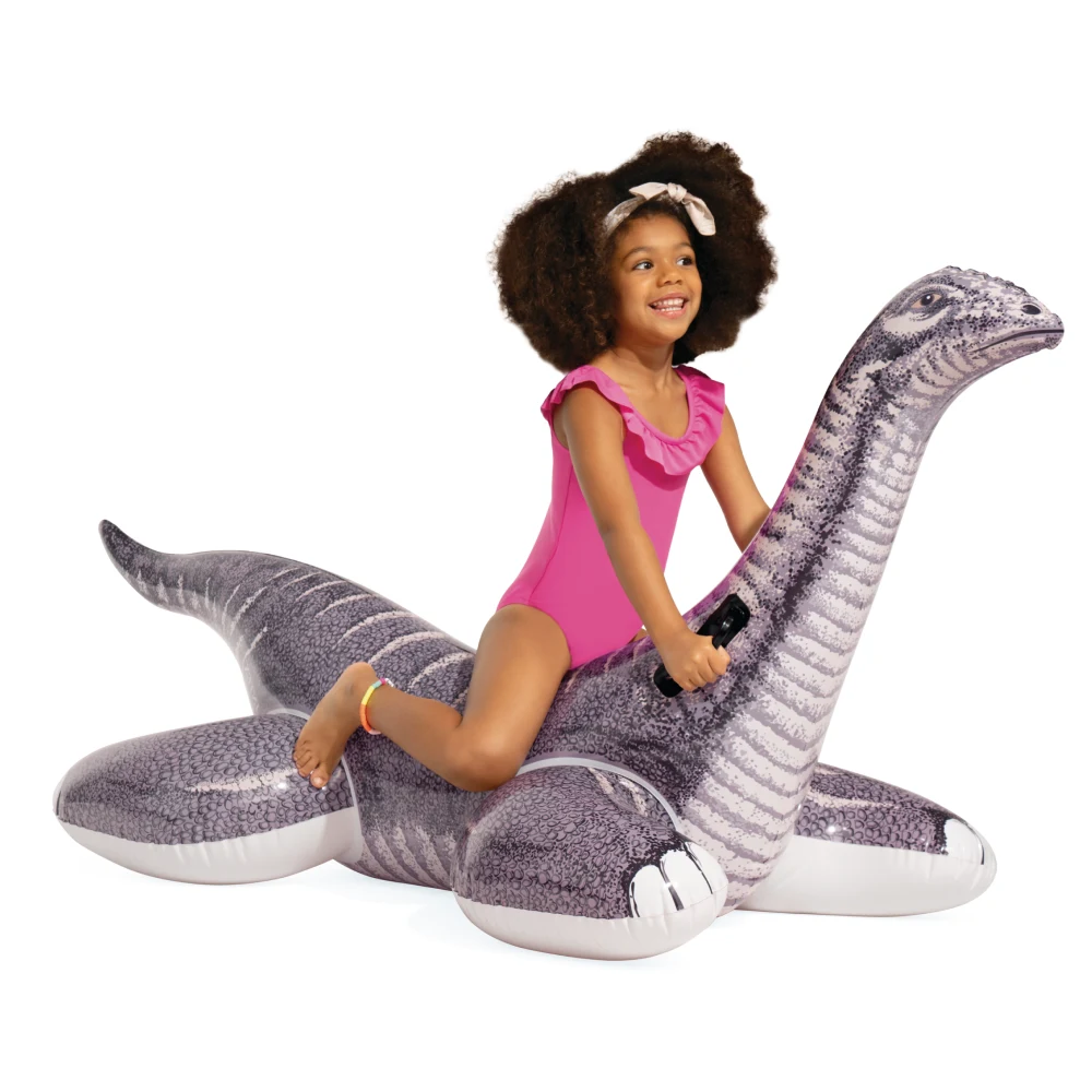 Plută gonflabilă cu design de dinozaur brontozaur, prevăzută cu mânere pentru prindere sigură, ideală pentru joacă pe apă în piscină sau la plajă.