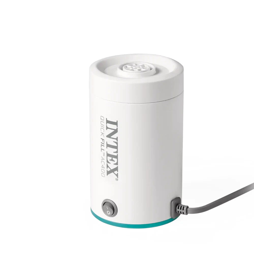 Pompă de aer electrică QuickFill AC400, 400 l/min, 220V, concepută pentru umflarea rapidă și eficientă a saltelelor gonflabile, piscinelor, colacilor, bărcilor și altor produse gonflabile. Compactă, ușor de utilizat la priză și echipată cu 2 duze interschimbabile, această pompă de aer electrică asigură umflare și dezumflare rapidă, economisind timp și efort.