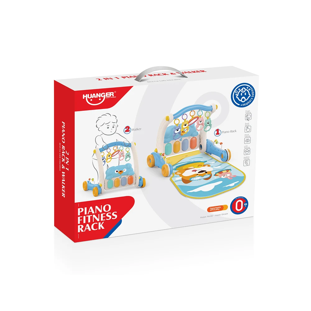 Acest premergător 2 în 1 este gândit pentru a însoți bebelușul în mai multe etape de dezvoltare. În primele luni, poate fi utilizat ca spațiu de joacă pe podea, datorită covorașului moale și colorat, dotat cu jucării suspendate care stimulează curiozitatea și coordonarea mână–ochi.