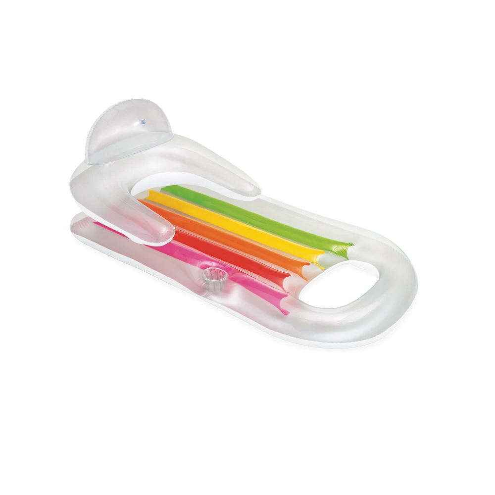 Această saltea gonflabilă tip șezlong este creată pentru momente de relaxare pe apă, oferind o poziție comodă datorită spătarului și cotierelor integrate. Forma ergonomică permite șederea stabilă în poziție semi-culcată, fiind potrivită pentru utilizare în piscină sau la mare.