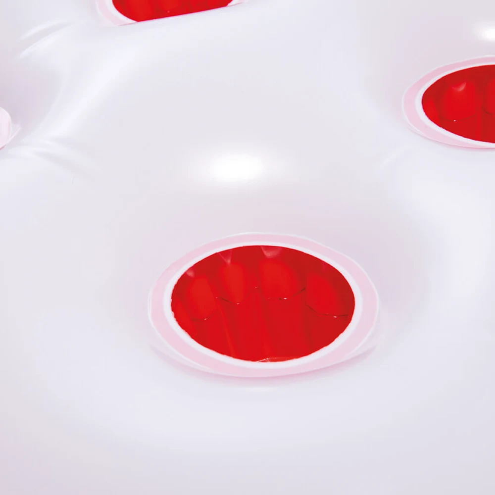 Saltea gonflabilă cu design atractiv de căpșună, prevăzută cu mânere pentru stabilitate și siguranță sporită pe apă. Dimensiunea generoasă și capacitatea de susținere o fac ideală pentru relaxare și distracție în piscină sau la mare.