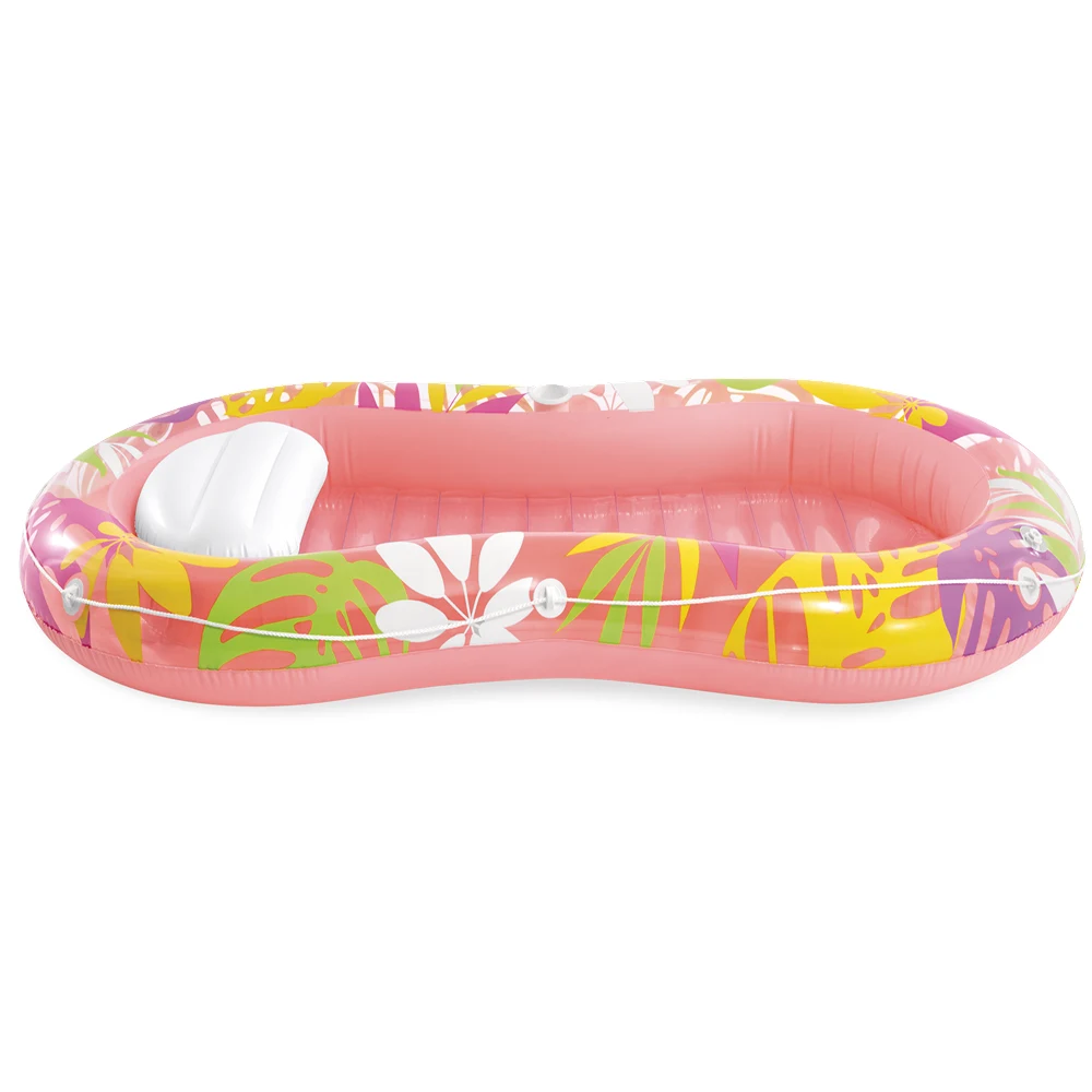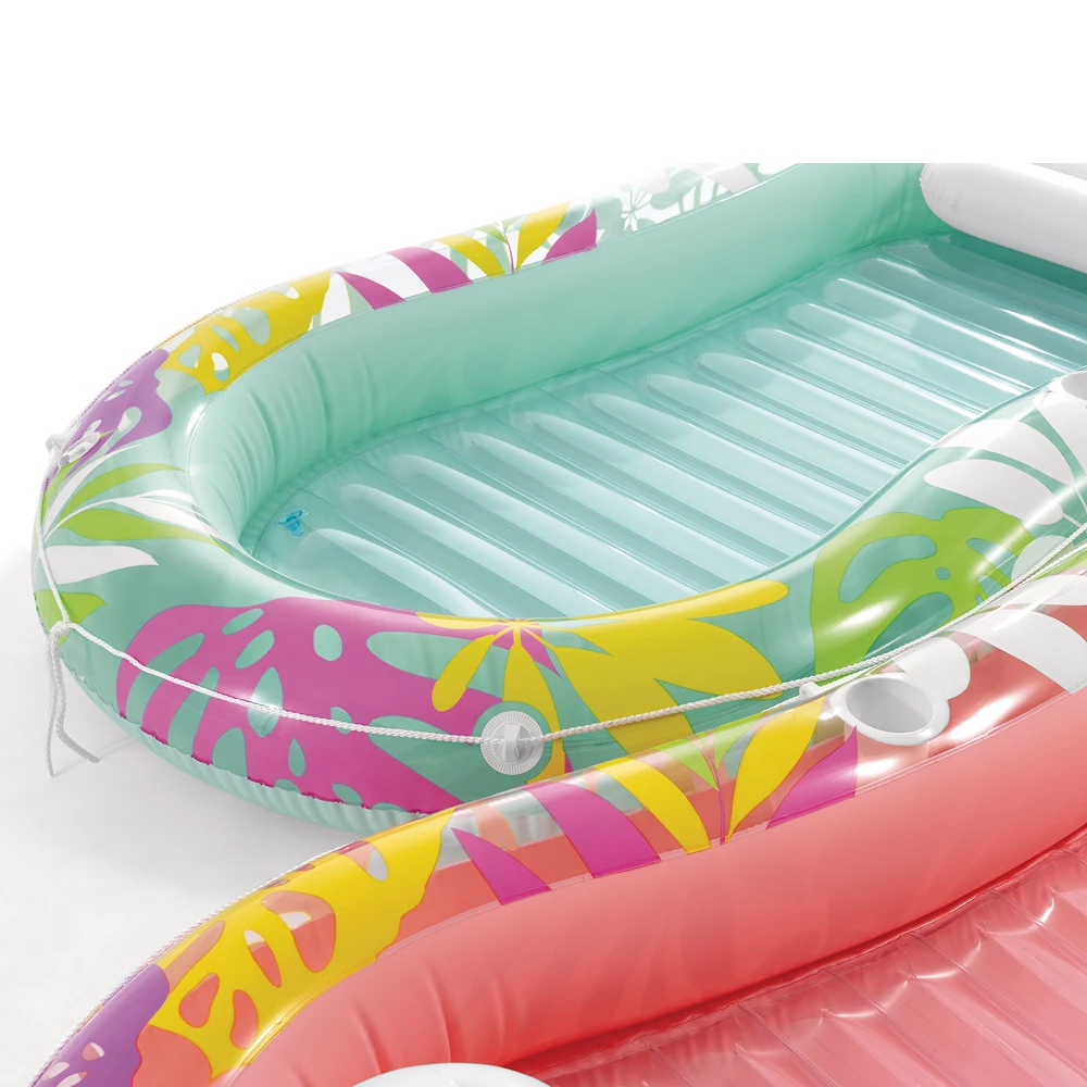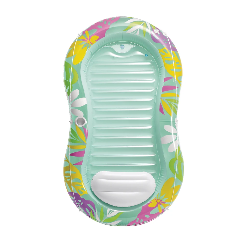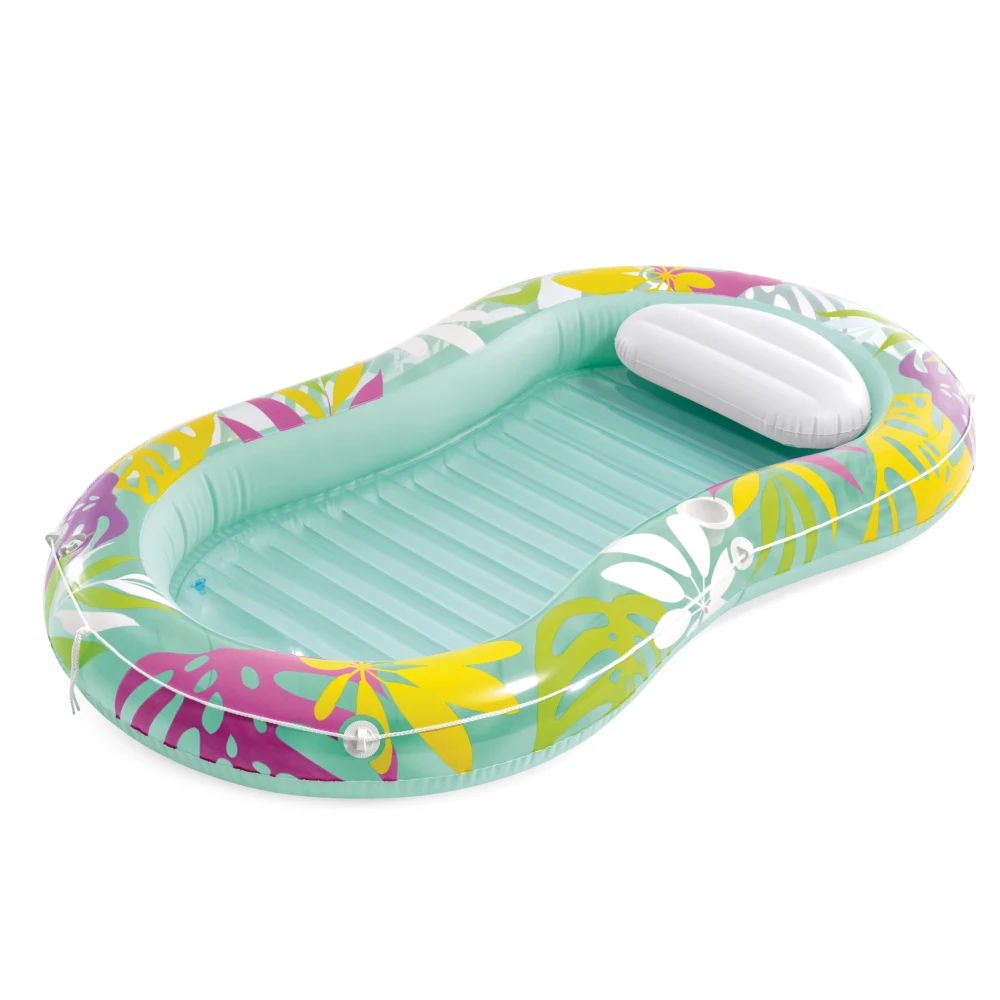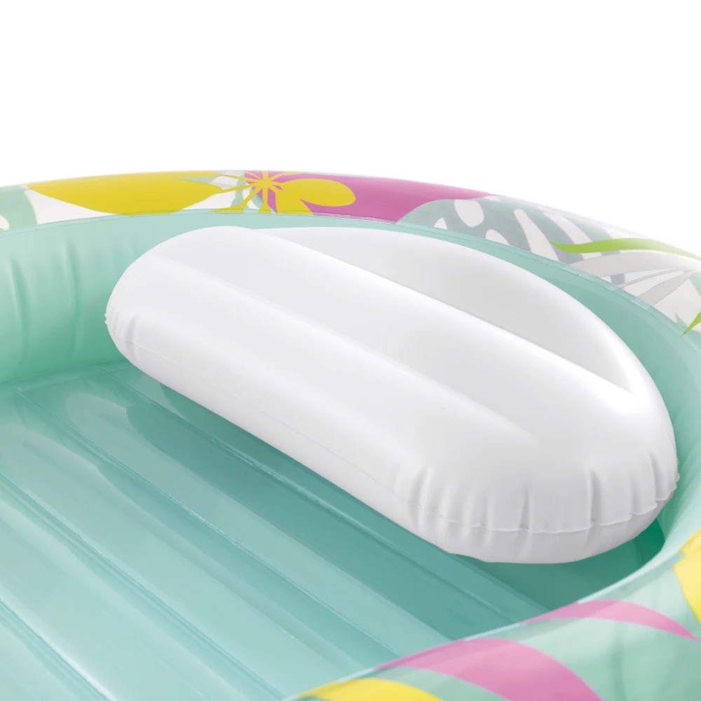 Saltea-șezlong gonflabilă cu design tropical, concepută pentru relaxare confortabilă pe apă, cu pernă integrată și margini înălțate pentru susținere plăcută în timpul utilizării.