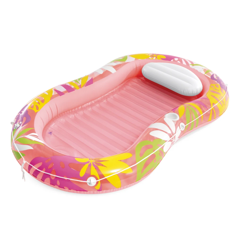 Salteaua-șezlong gonflabilă Tropical Oasis este ideală pentru momente de relaxare la piscină sau pe apă, oferind un echilibru reușit între confort și stabilitate. Forma tip șezlong permite o poziție comodă de odihnă, iar perna integrată susține capul pentru un plus de confort.