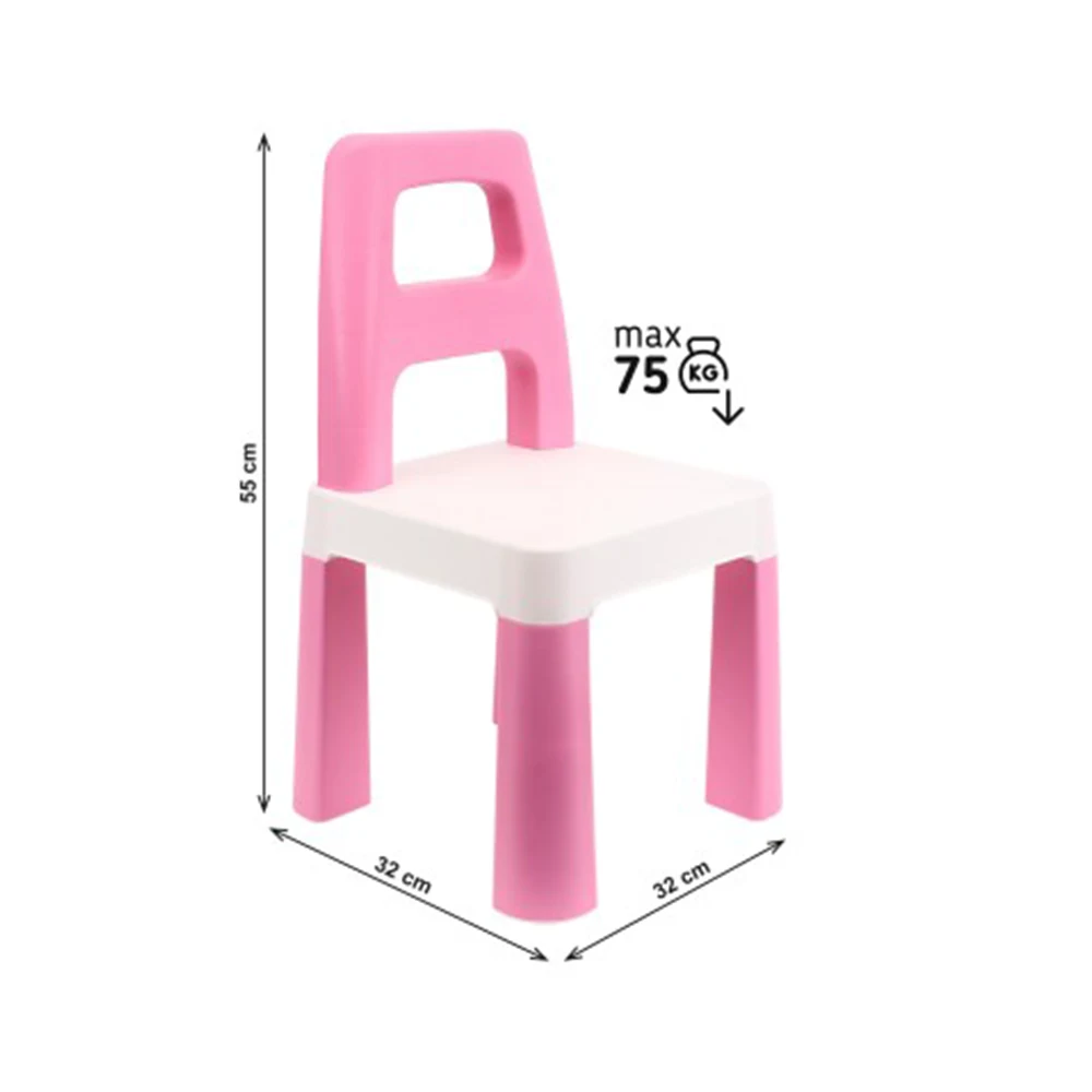 Scaunul pentru copii roz este conceput special pentru copiii de la 1,5 ani, oferind o poziție confortabilă și sigură în timpul activităților zilnice. Realizat din plastic rezistent, scaunul are o structură stabilă și poate susține o greutate de până la 75 kg, fiind potrivit pentru utilizare îndelungată.