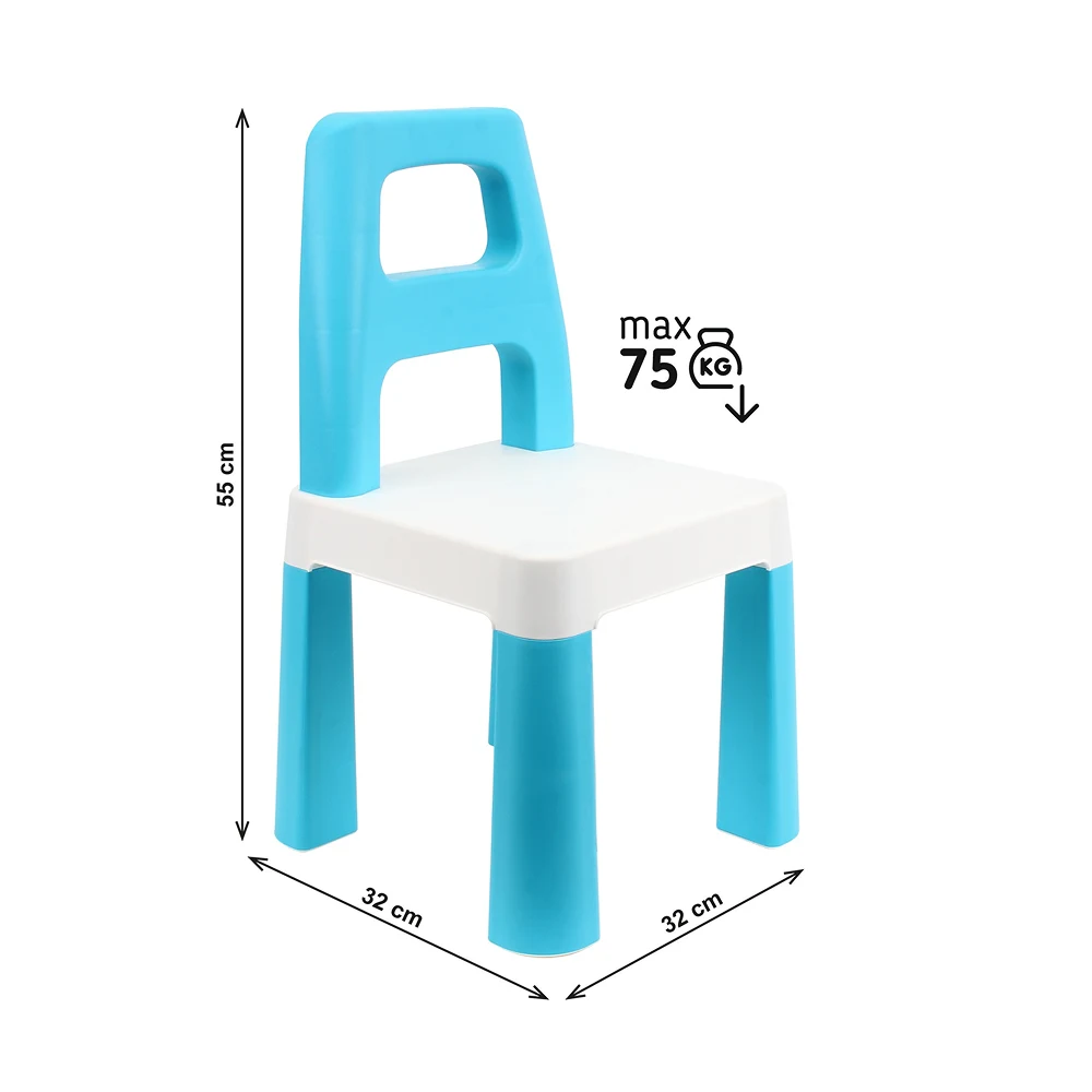 Fabricat din materiale rezistente și sigure, scaunul este ușor de mutat și întreținut. Designul simplu și culoarea albastră îl fac potrivit atât pentru băieți, cât și pentru fete, fiind ideal pentru utilizare zilnică.