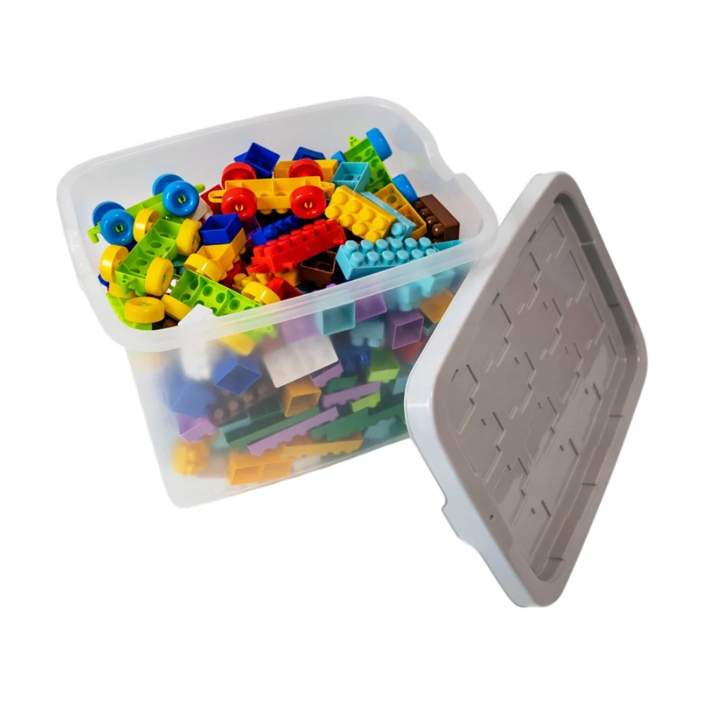 Set de construcție pentru copii cu 335 piese și cutie de depozitare, ideal pentru joacă creativă și dezvoltarea imaginației.