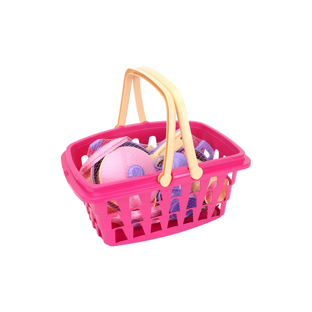 Set de veselă și ustensile pentru copii de la 3 ani, depozitate într-un coș practic. Ideal pentru jocuri de rol și activități imaginative.