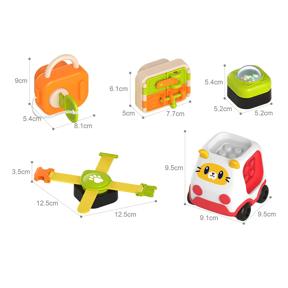 Setul educativ senzorial cu activități și mașinuță este ideal pentru joaca exploratorie a copiilor mici, oferind o varietate de jucării interactive într-un singur pachet. Setul include mai multe piese cu funcții diferite, precum mecanisme de rotire, glisare, apăsare și elemente mobile, care stimulează curiozitatea și învățarea prin joacă.