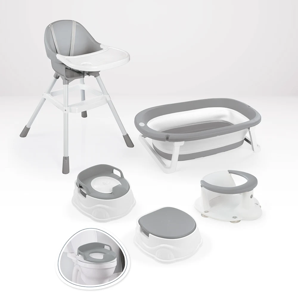 Setul include scaun de masă pentru copii, cadă pentru baie, suport pentru baie, oliță, scăunel și adaptor, toate realizate din materiale sigure și ușor de curățat. Scaunul de masă este prevăzut cu centură de siguranță și tavă detașabilă, oferind stabilitate și protecție în timpul utilizării.