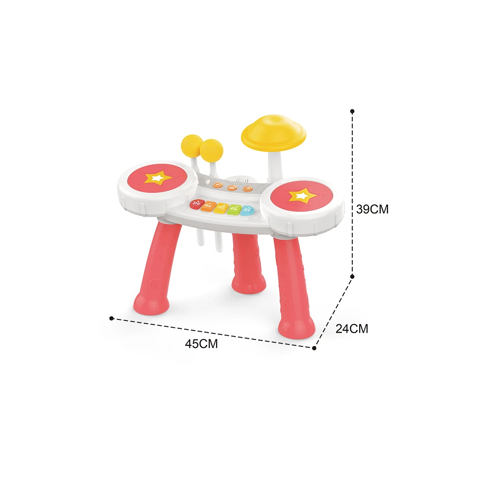 Setul este prevăzut cu tobe, butoane muzicale și elemente interactive care emit sunete și lumini, stimulând atenția și interesul copilului. Prin lovirea tobelor și apăsarea butoanelor, copilul își dezvoltă coordonarea mână-ochi, motricitatea fină și simțul ritmic.