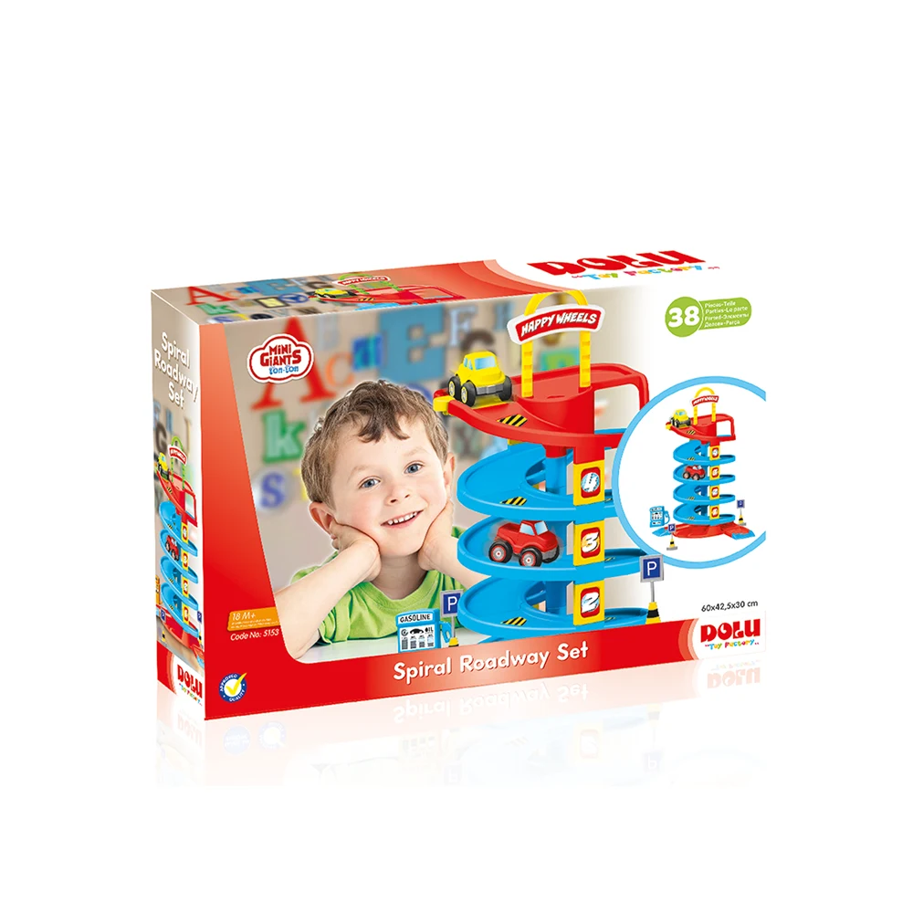 Setul de parcare auto cu pistă spiralată este o jucărie interactivă care oferă copiilor ore întregi de distracție și joacă creativă. Construcția verticală cu rampă spiralată permite mașinuțelor să coboare de la nivelul superior până la bază, stimulând curiozitatea și coordonarea copilului.