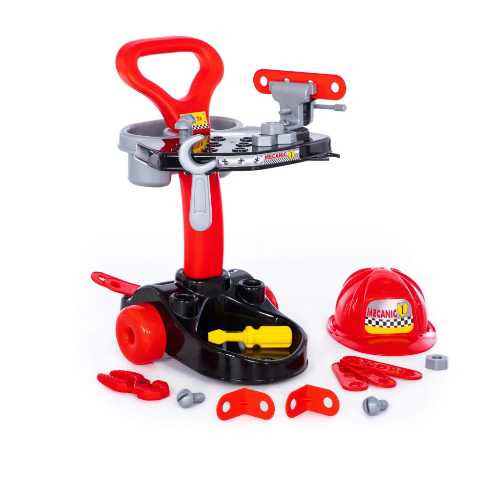 Setul pentru mecanic Polesie este o jucărie de rol completă, cu cărucior mobil, banc de lucru și accesorii, ideală pentru joacă educativă și creativă.