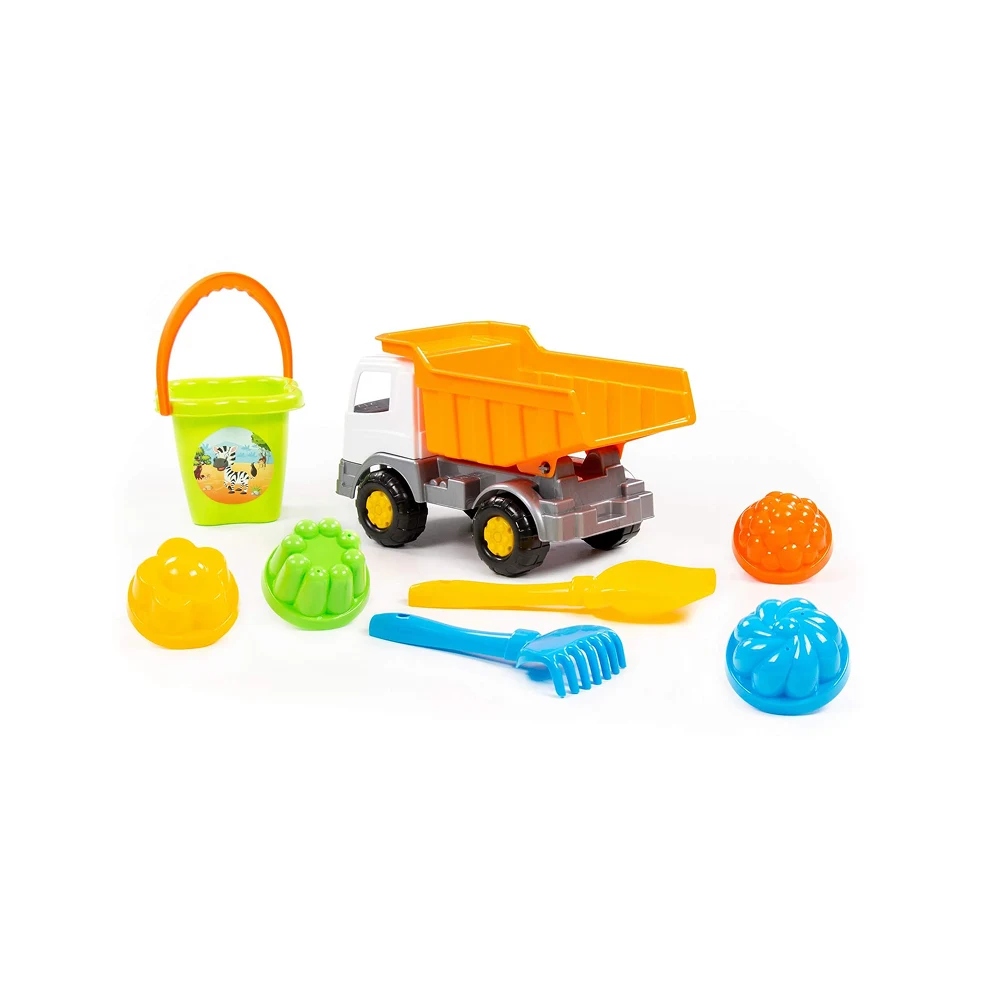 Set de joacă pentru nisip cu camion basculant și accesorii, ideal pentru joaca în aer liber, la plajă sau în nisipar.