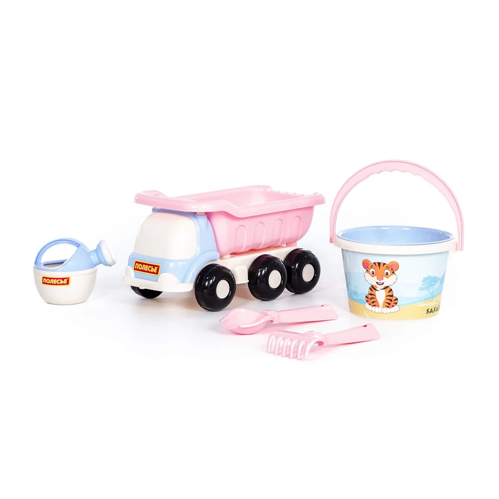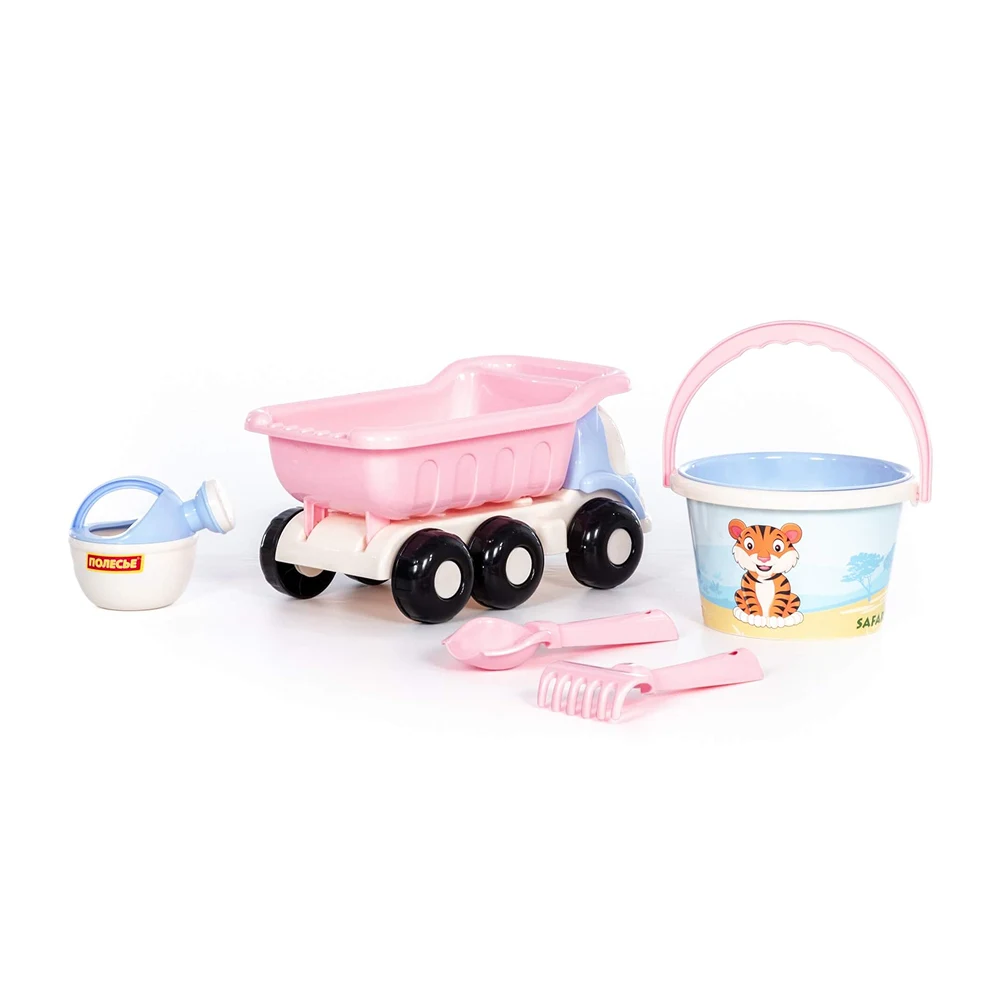 Set complet pentru joaca în nisip, cu camion basculant, găleată și accesorii, ideal pentru plajă, nisipar sau joaca în aer liber.