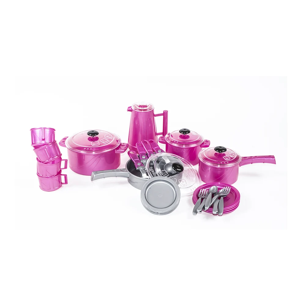 Setul de veselă Kristinka 3, recomandat copiilor de 3+ ani, include ceainic, tigaie, oală mare, cratiță mică, 4 farfurii, 4 căni, 4 farfurii pentru căni, lingurițe, furculițe și alte ustensile necesare pentru joaca de bucătărie.