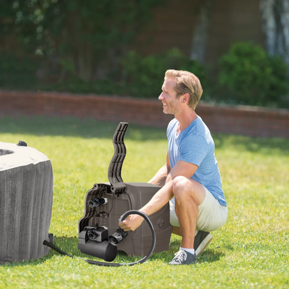 Spa gonflabil cu hidromasaj PureSpa™ Greywood Deluxe pentru 4 persoane, cu capacitate de 795 L, conceput pentru relaxare premium în confortul propriei case. Sistemul de aeromasaj cu bule oferă un masaj uniform și relaxant, iar încălzirea integrată și filtrarea performantă cu cartuș S2 asigură apă curată și temperatură constantă. Include capac termoizolant, două tetiere premium, lumină LED multicoloră și panou de control wireless prin aplicație, pentru o experiență completă, elegantă și ușor de utilizat.