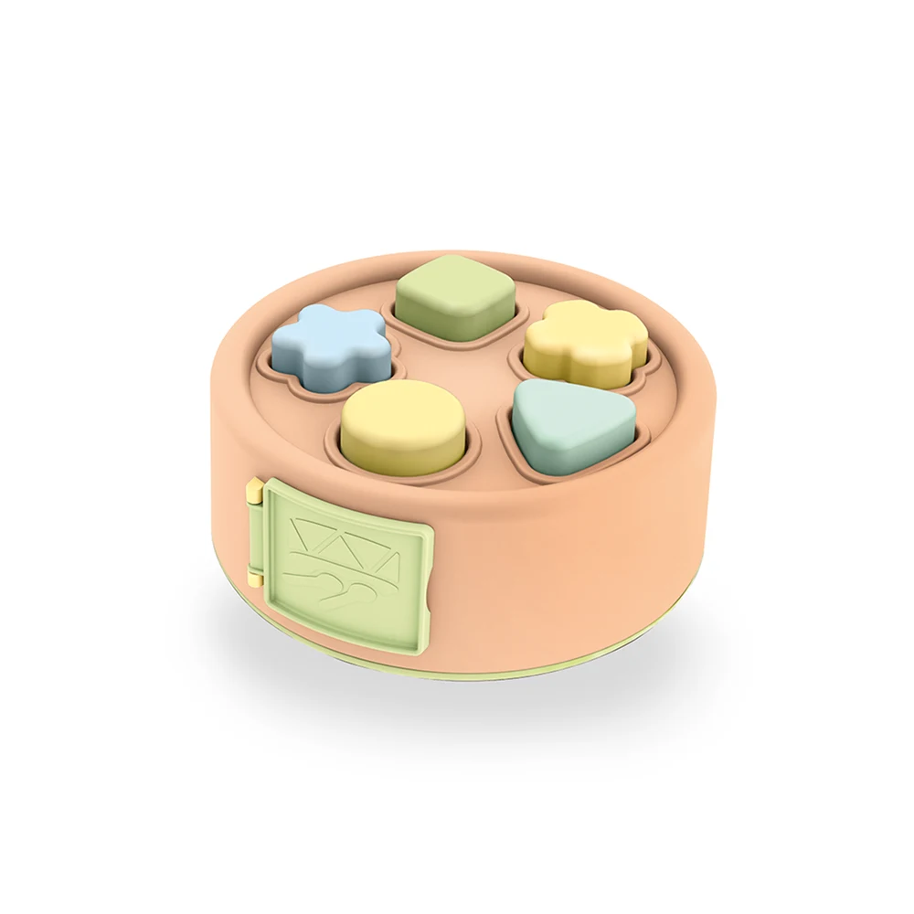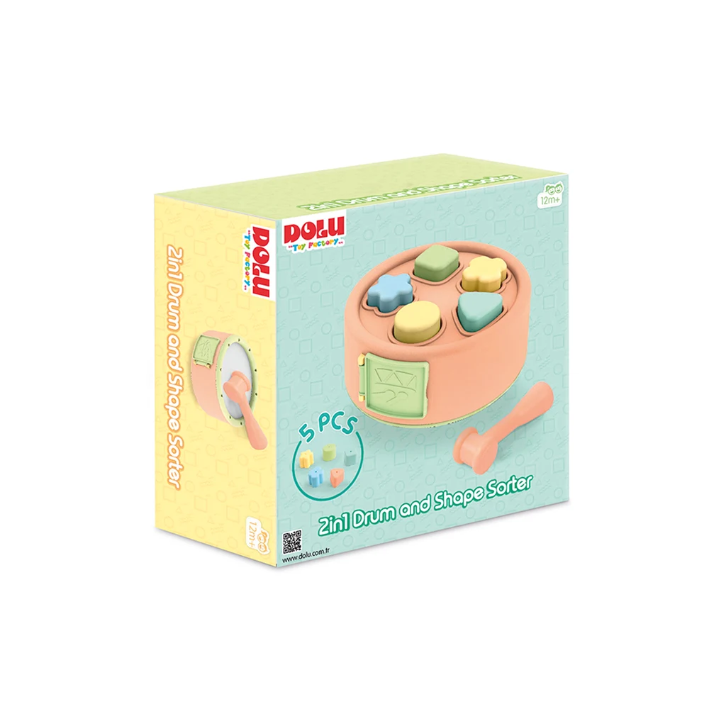 Jucărie educativă 2 în 1 care combină o tobă distractivă cu un sorter de forme, ideală pentru stimularea dezvoltării timpurii a copiilor prin joacă activă și interactivă.