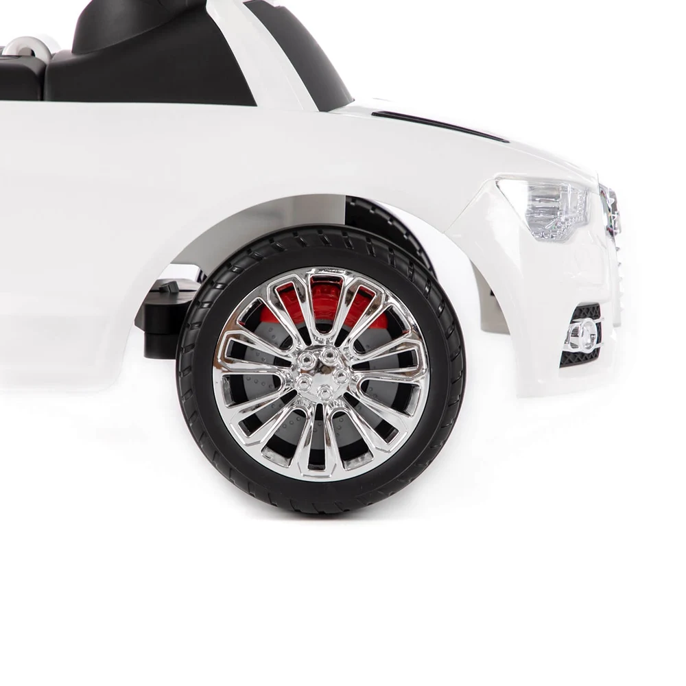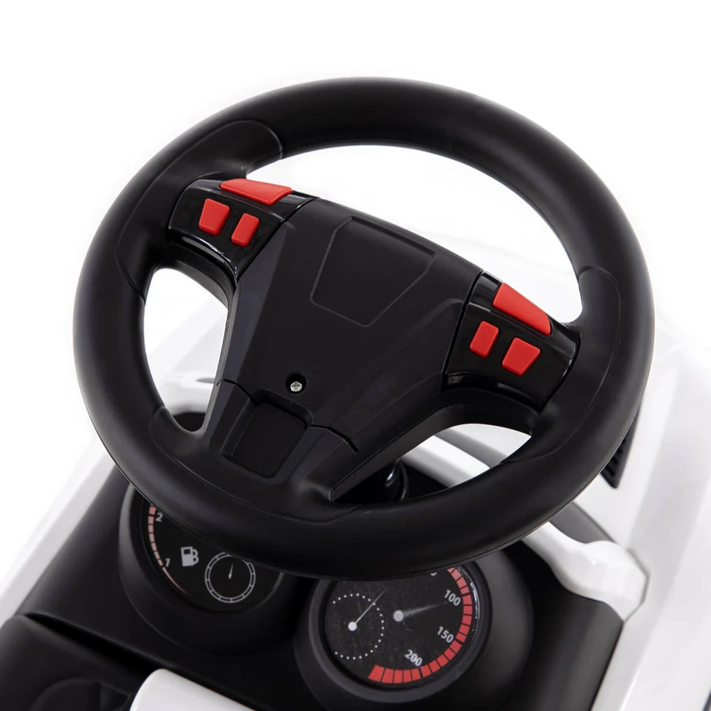 Mașinuța este dotată cu volan cu semnal sonor, oferind un plus de realism și distracție în timpul jocului. Șezutul este confortabil și stabil, iar spătarul ajută copilul să stea corect și în siguranță.