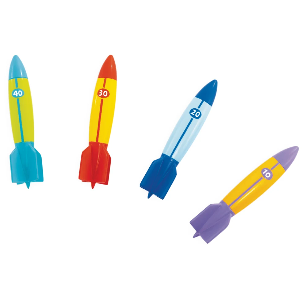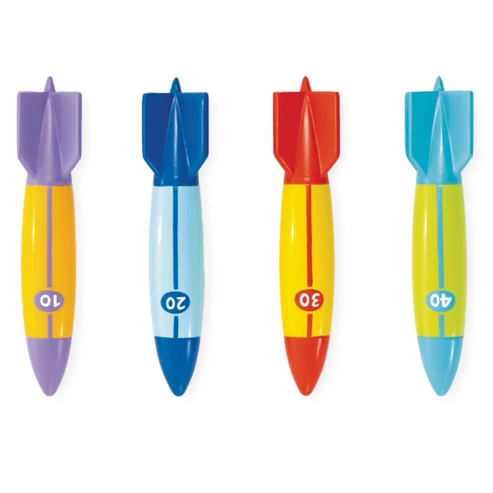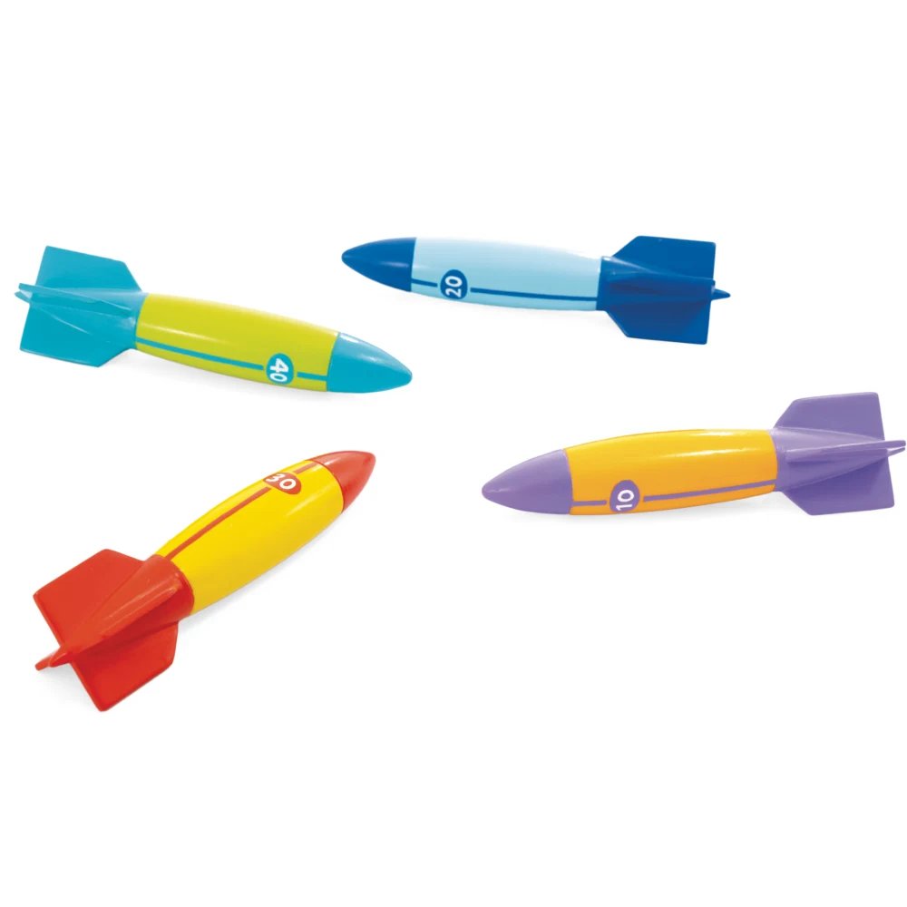 Torpile pentru scufundări în piscină, concepute pentru jocuri interactive sub apă. Setul include 4 piese colorate, ușor de observat și de recuperat, ideale pentru distracție activă în piscină.