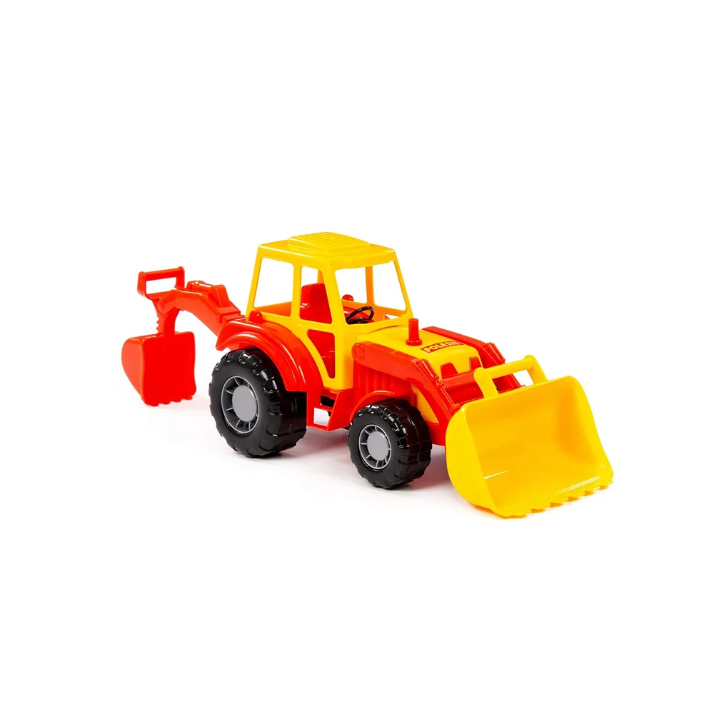 Tractor multifuncțional pentru copii, echipat cu cupă frontală și excavator posterior, ideal pentru jocuri de construcție și lucrări imaginare.