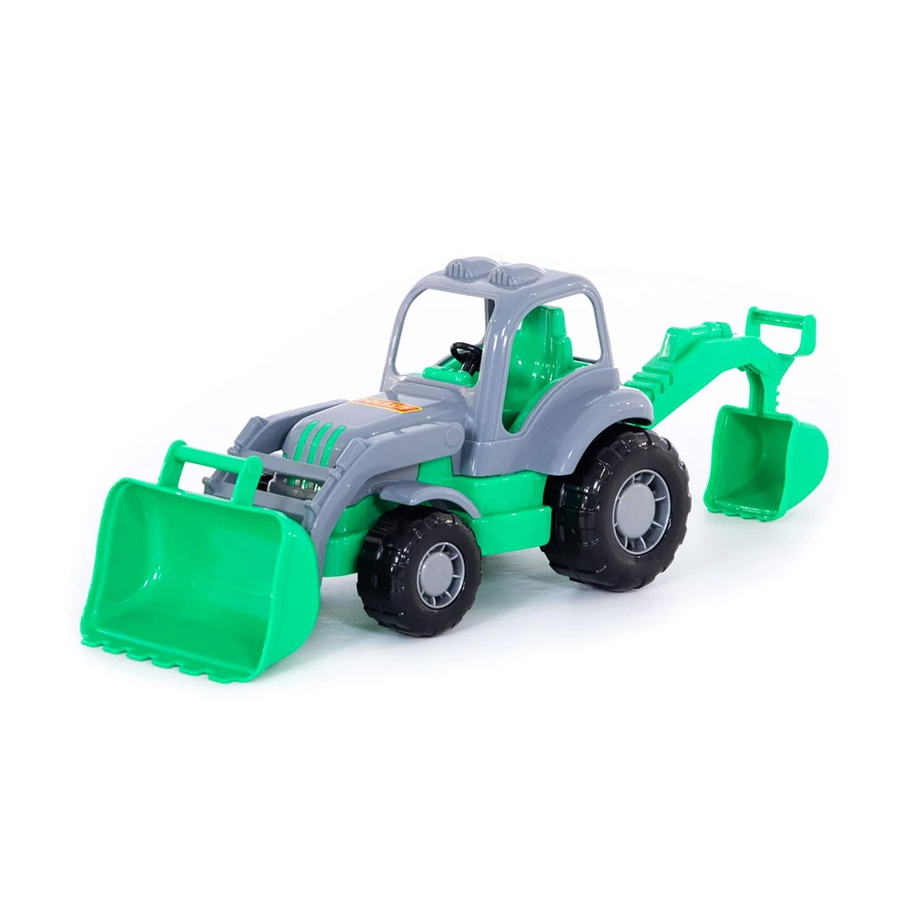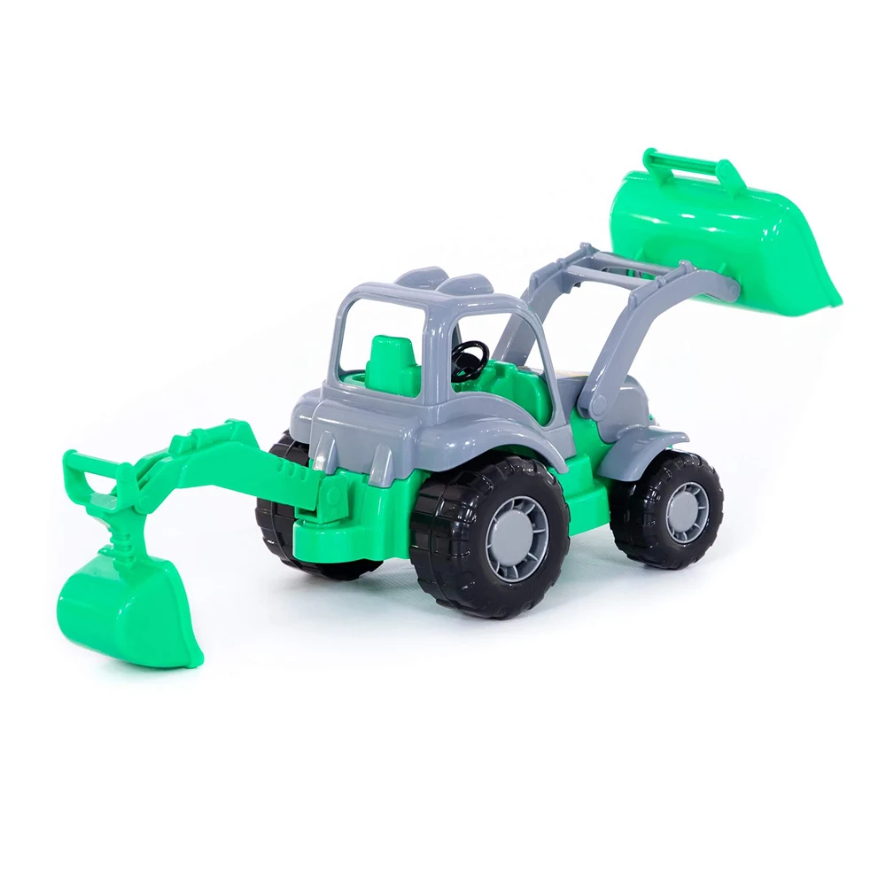 Tractor de jucărie cu excavator și cupă frontală, ideal pentru jocuri de construcții și joacă de rol, realizat din plastic rezistent și sigur pentru copii.