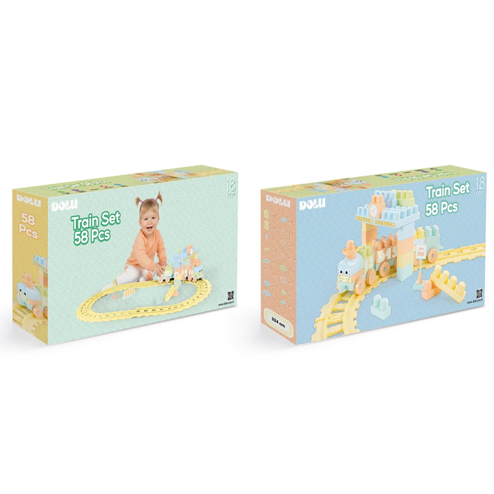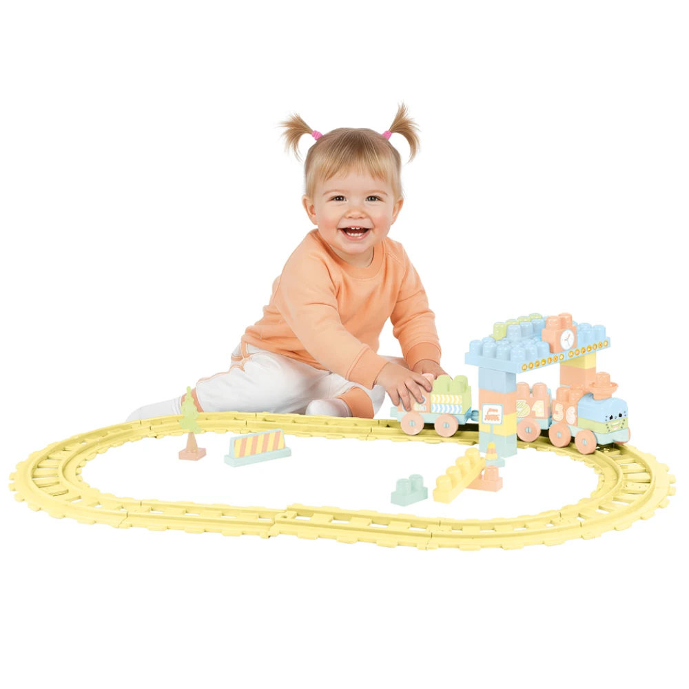 Tren pentru copii cu piese de construcție și șină, conceput pentru joacă interactivă și dezvoltarea creativității. Setul include 58 de piese care permit construirea trenului și realizarea unui traseu extins, oferind o experiență de joc mai complexă.