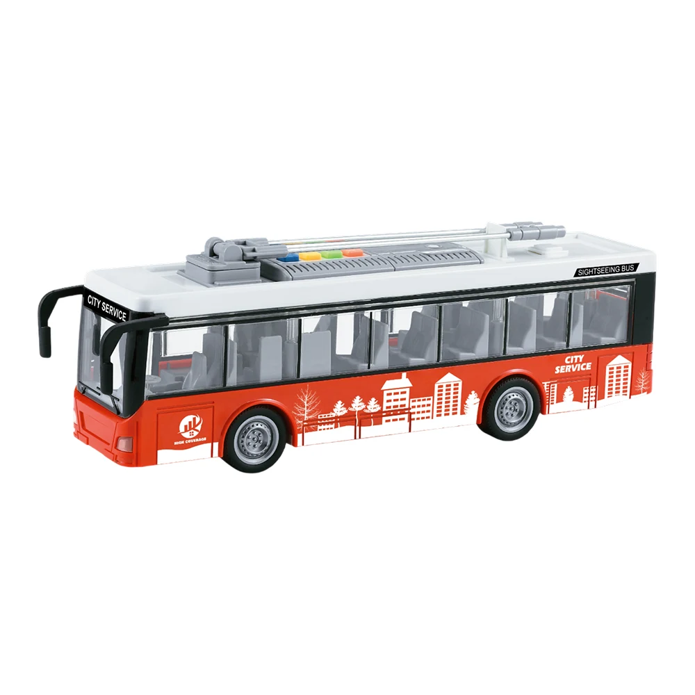 Troleibuz de jucărie realist, cu inerție, lumini și sunete, ideal pentru joaca de tip oraș și transport urban, potrivit pentru copii de la 3 ani.