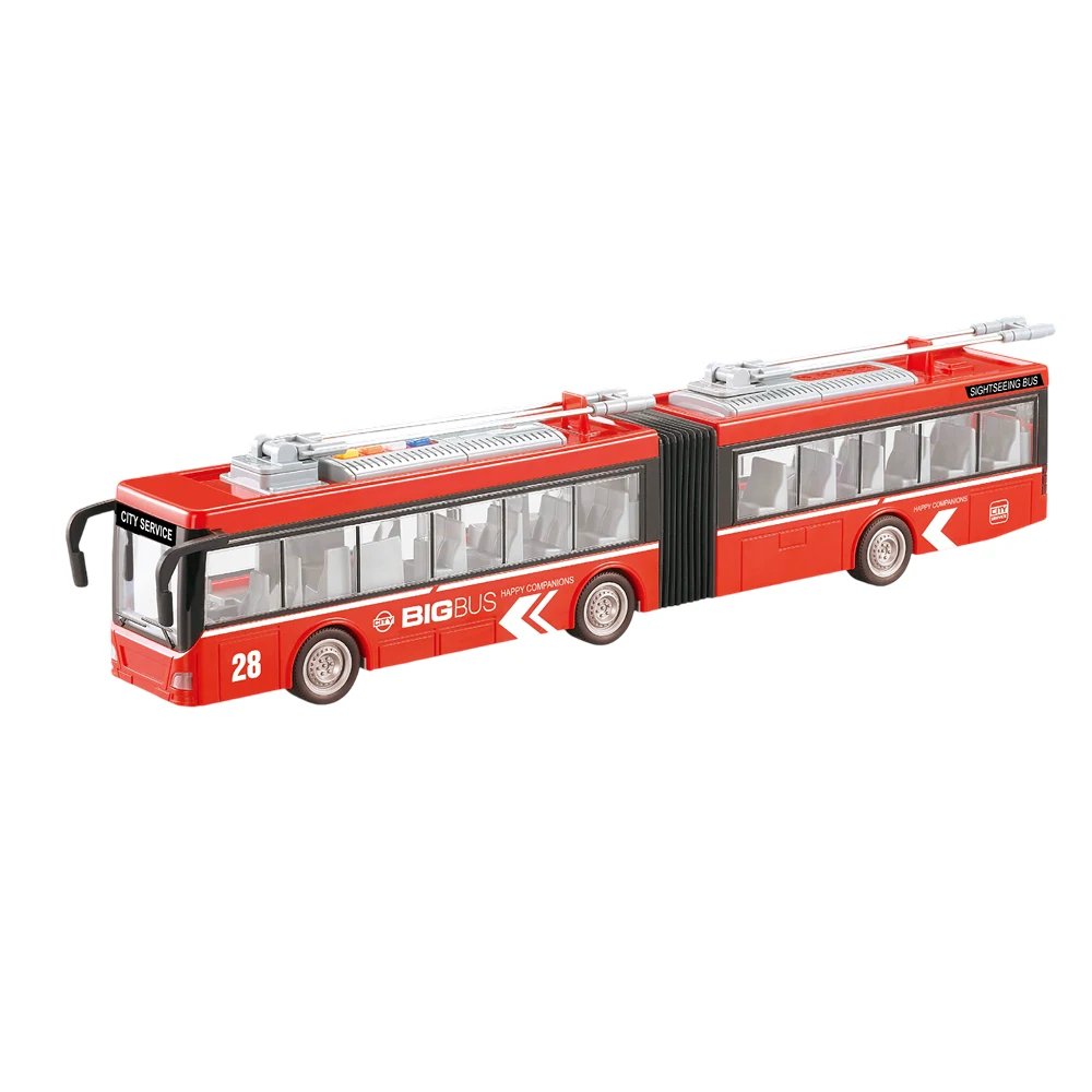 Troleibuz pentru copii, cu sistem cu inerție, lumini și sunete, realizat la scară 1:16, ideal pentru jocuri de rol inspirate din transportul public urban.